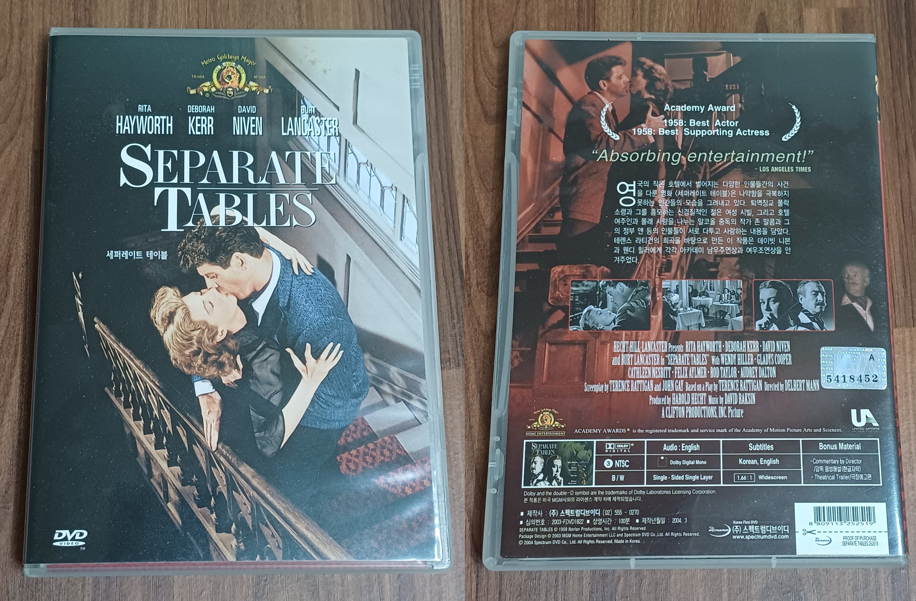 "세퍼레이트 테이블"은 테렌스 라티간의 희곡을 영화화한 작품입니다. 영국 본머스의 호텔을 무대로 설정하고 있는데 서로 애정을 가지고 있으면서도 상대방에게 상처를 주고 갈등하는 관계의 이야기를 그리고 있어요. 출연진 중에서 데보라 카의 역할이 이색적으로 다가오더군요. 소심하고 신경쇠약에 빠진 느낌마저 드는 여성을 연기하고 있죠. 데보라 카가 다른 영화들에서 흔히 보여주던 차분하고 성숙한 여성의 모습과는 다른 듯해서 보는 즐거움이 있더군요. 원래 기획안은 로렌스 올리비에와 비비안 리가 각각 1인 2역을 맡는 거였다고 감독 음성해설에서 이야기하더군요. 델버트 만 감독이 연출을 맡게 되면서 네 명의 배우가 각 캐릭터를 연기하는 현재 모습이 되었다고 하는데 1인 2역의 형식으로 만들었어도 그것대로 아주 흥미로웠을 듯 해요. DVD에 수록된 감독 음성해설에서 재미난 제작 이야기를 많이 들을 수 있었어요. 영화 "마티" 때도 리허설을 했다고는 하는데 "세퍼레이트 테이블"을 연출하면서 유명한 배우들을 데려다 놓고 3주나 리허설을 했다고 하죠. 제작자와 관련된 갈등도 상당했던 듯 한데 최종적으로는 제작자가 영화를 재편집하게 되었다고 해요. 델버트 만이 자유롭게 연출을 하고 싶어서 후에 영화를 떠나서 TV에서 주로 일을 하게 되었다고 언급을 하는데 슬픈 현실 결론이네요.