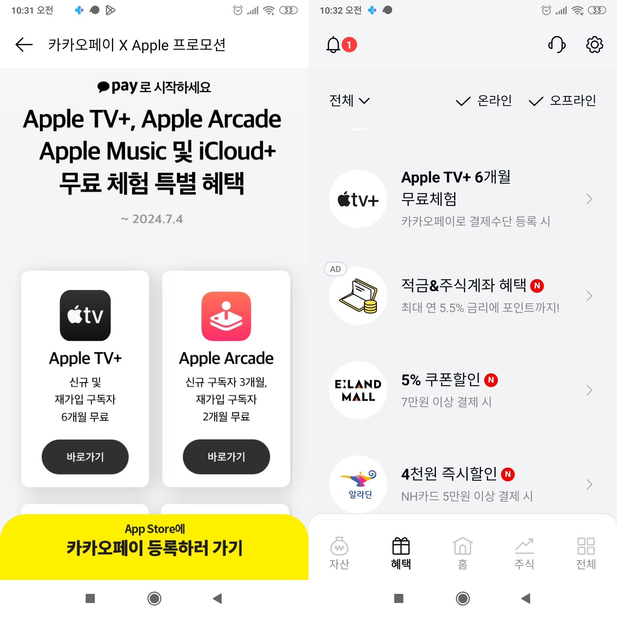 문제없이 프로모션 적용이 가능하네요. 카카오페이 앱에서 '혜택'