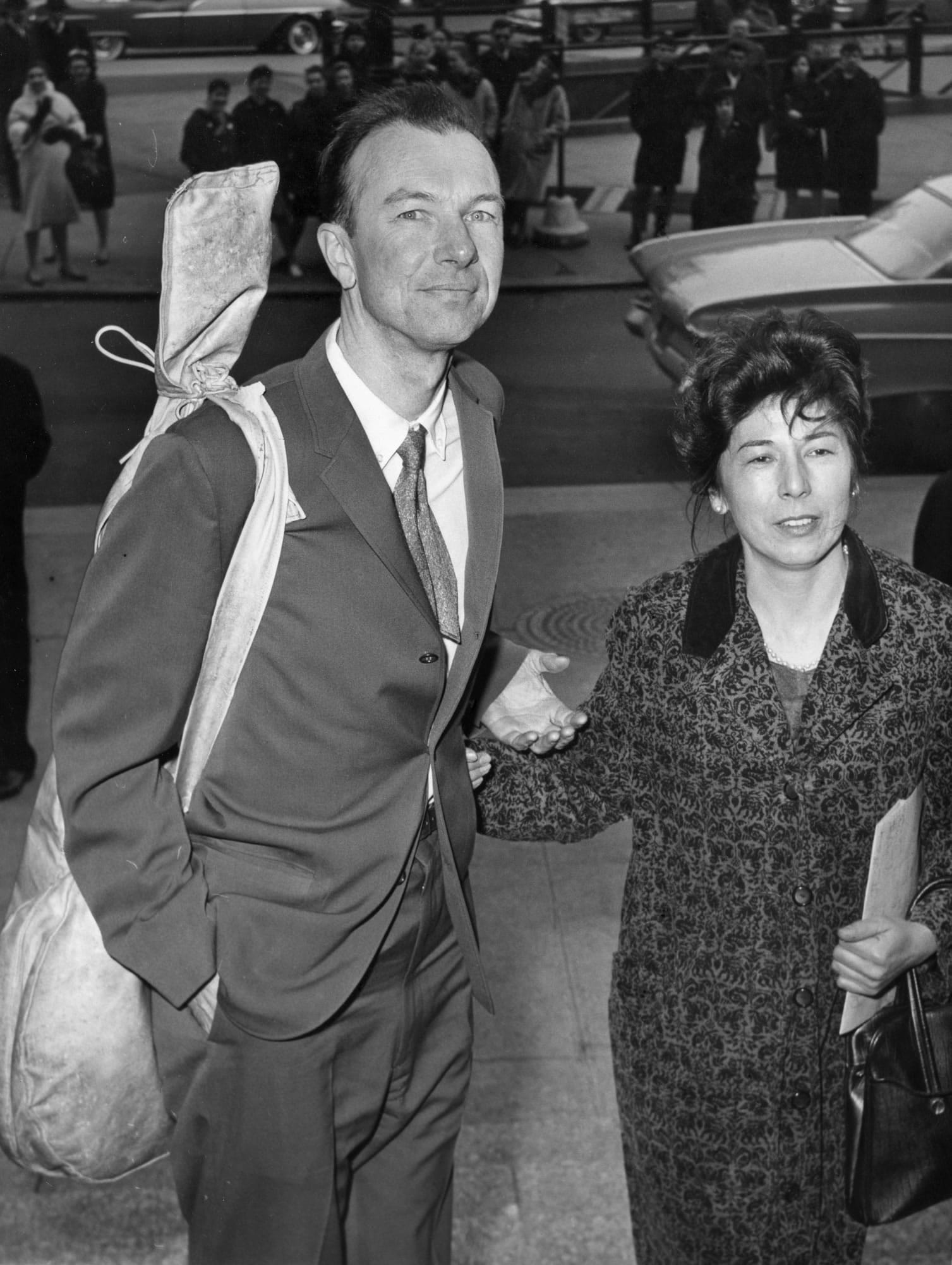 1961년 4월 4일 밴조를 메고 뉴욕 연방법원에 출두한 피트 시거. 부인 토시 시거와 함께.
