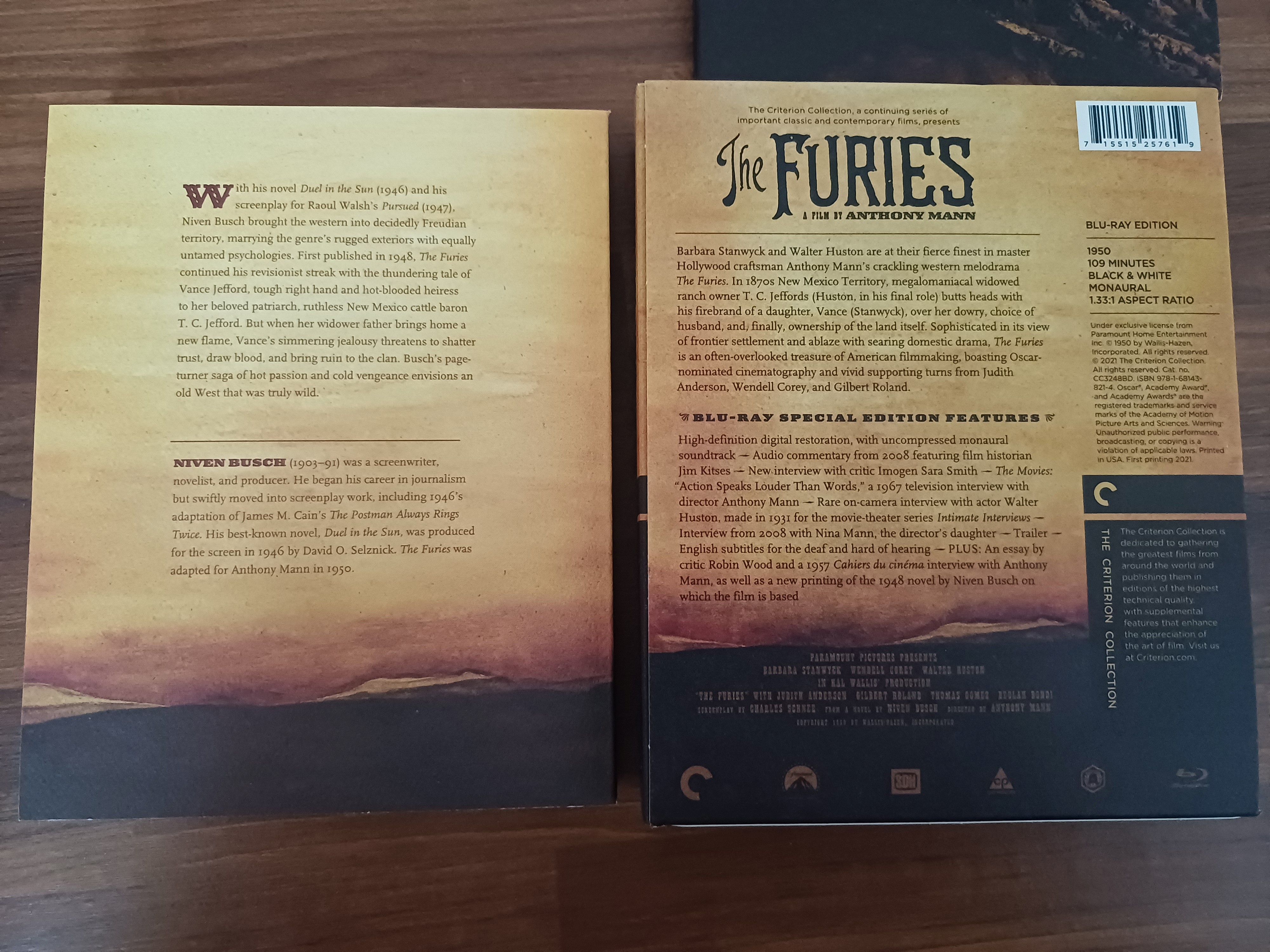 크라이테리언 컬렉션에서 나온 격노 블루레이는 시나리오 작가이자 소설가인 니벤 부슈의 소설을 같이 담고 있어요. " 행잉록에서의 소풍"이나 "여섯 개의 도덕 이야기" 블루레이 패키지도 소설이 같이 포함되어 있는데 한 번씩 책장에서 꺼낼 때마다 아주 흡족한 기분이 들더군요. 소책자에는 평론가 로빈 우드의 에세이도 실려 있고 카이에 뒤 시네마 1957년 3월호에 실렸던 클로드 샤브롤과 안소니 만의 인터뷰도 담고 있습니다. 좋아하는 신진급 감독들에 대한 언급을 하는데 프레드 진네만, 로버트 알드리치, 리차드 브룩스, 스탠리 큐브릭 같은 이름들이 등장하네요. 이제는 다 고인이 되었을 정도로 시간이 흐른 시점에서 명감독들의 이름을 접하니깐 남다른 느낌이 있네요.