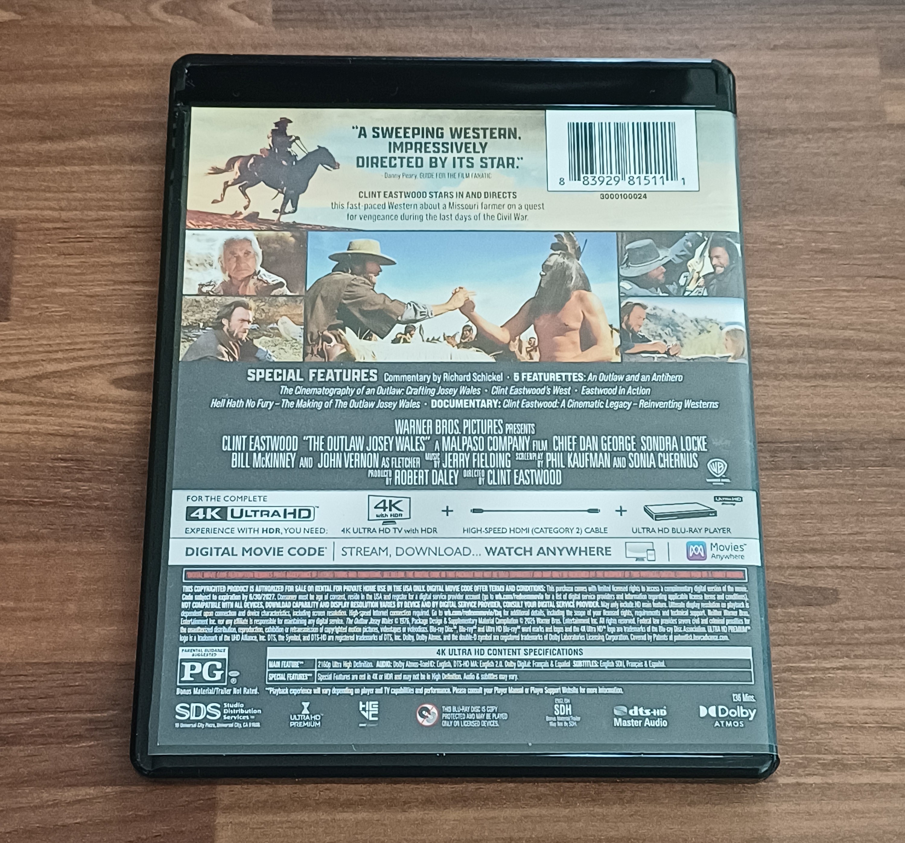 올해 '더티 해리', '페일 라이더','무법자 조시 웨일즈'가 4K 블루레이로 출시가 되었죠. 무법자 조시 웨일즈 일반판 4K 블루레이입니다. 4K 블루레이 디스크 한 장만 수록이 되어 있습니다. 커버 이미지가 단촐한 느낌이 듭니다. 잠깐 디스크를 플레이 해봤는데 메뉴 디자인은 예전 포스터와 느낌이 비슷한게 근사하더군요. 이걸 커버 이미지에 사용하면 좋았을텐데... 하는 생각이 들다가 한정판에는 그 이미지를 썼더라고요.