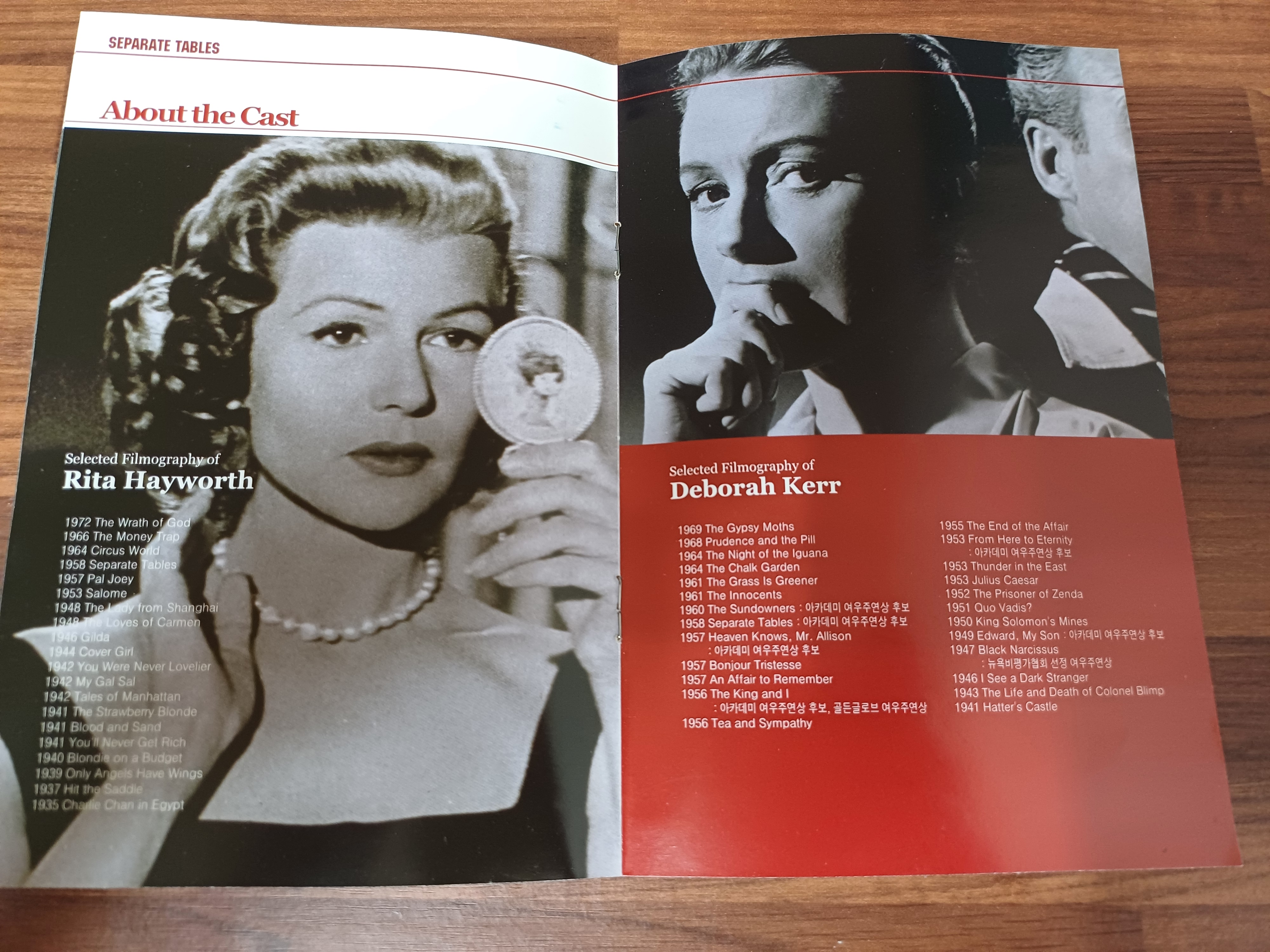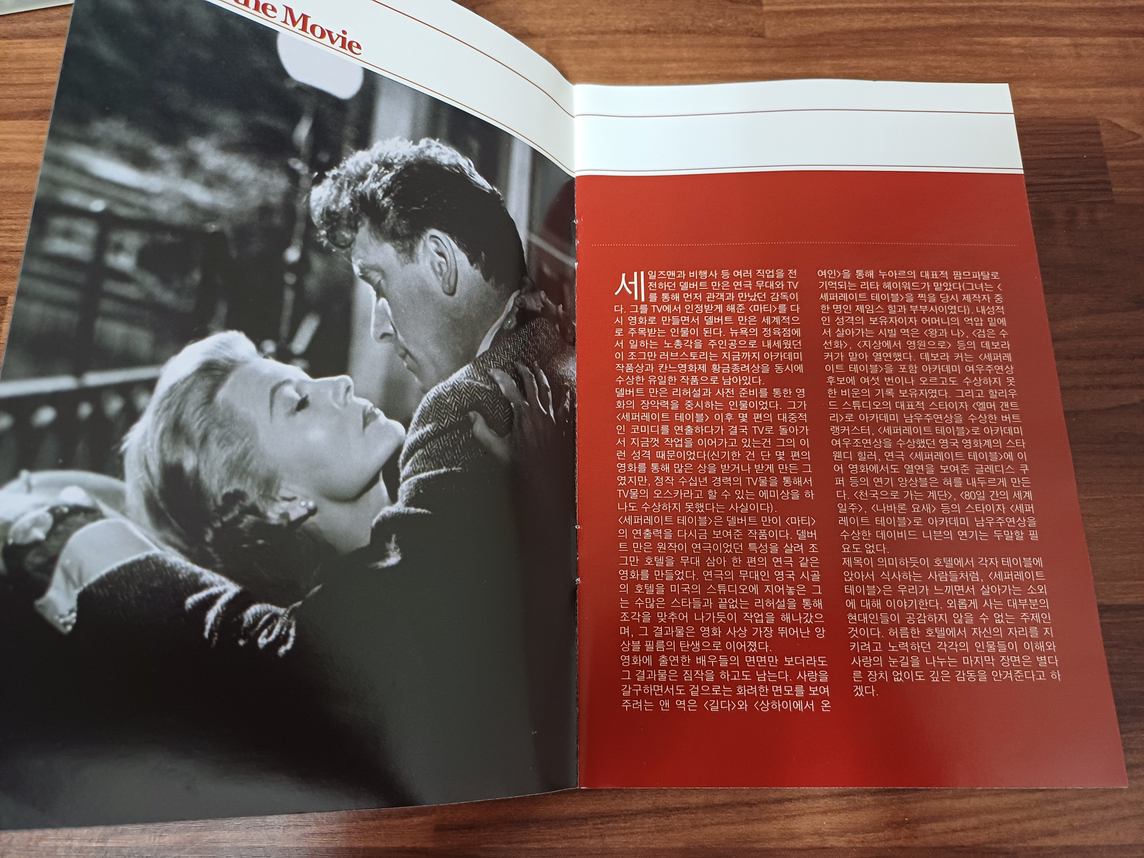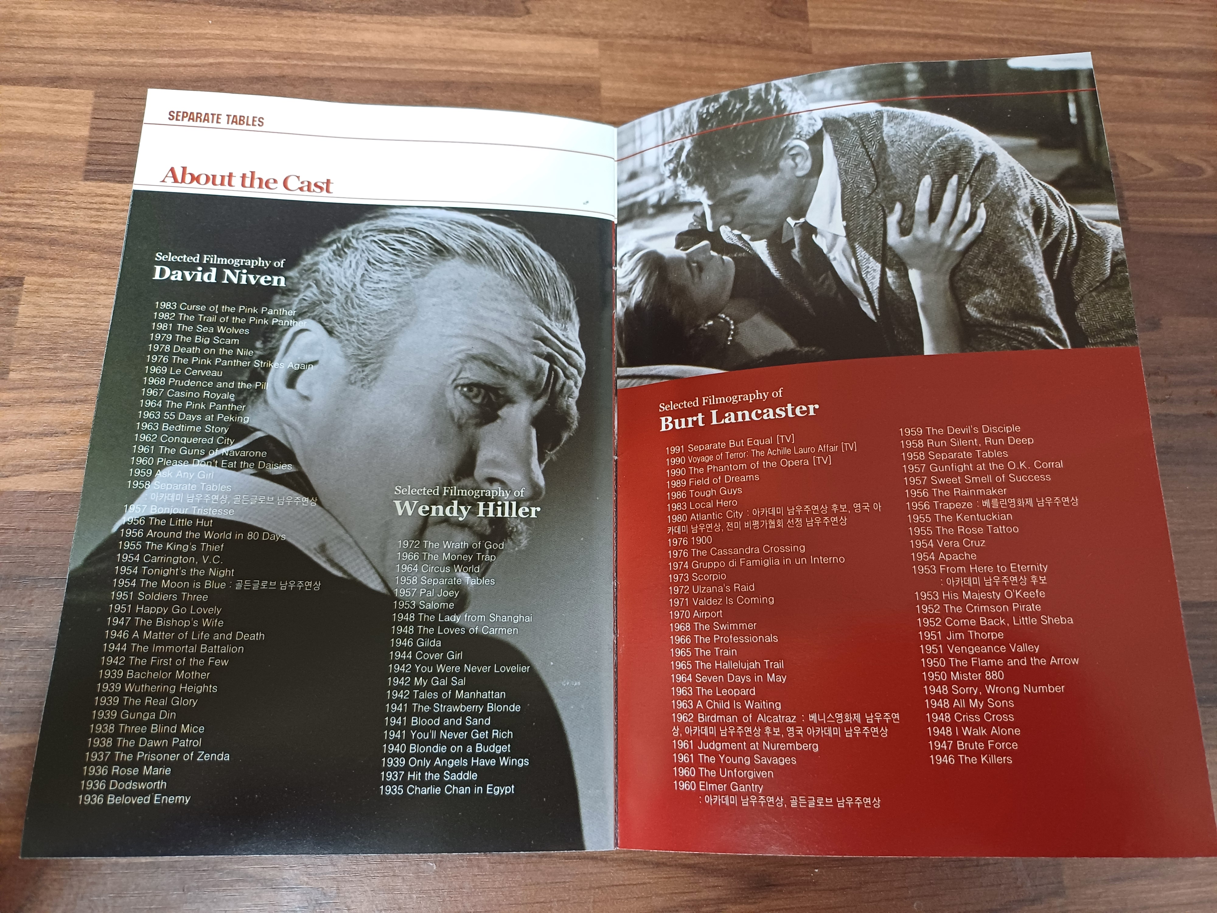 "세퍼레이트 테이블"은 테렌스 라티간의 희곡을 영화화한 작품입니다. 영국 본머스의 호텔을 무대로 설정하고 있는데 서로 애정을 가지고 있으면서도 상대방에게 상처를 주고 갈등하는 관계의 이야기를 그리고 있어요. 출연진 중에서 데보라 카의 역할이 이색적으로 다가오더군요. 소심하고 신경쇠약에 빠진 느낌마저 드는 여성을 연기하고 있죠. 데보라 카가 다른 영화들에서 흔히 보여주던 차분하고 성숙한 여성의 모습과는 다른 듯해서 보는 즐거움이 있더군요. 원래 기획안은 로렌스 올리비에와 비비안 리가 각각 1인 2역을 맡는 거였다고 감독 음성해설에서 이야기하더군요. 델버트 만 감독이 연출을 맡게 되면서 네 명의 배우가 각 캐릭터를 연기하는 현재 모습이 되었다고 하는데 1인 2역의 형식으로 만들었어도 그것대로 아주 흥미로웠을 듯 해요. DVD에 수록된 감독 음성해설에서 재미난 제작 이야기를 많이 들을 수 있었어요. 영화 "마티" 때도 리허설을 했다고는 하는데 "세퍼레이트 테이블"을 연출하면서 유명한 배우들을 데려다 놓고 3주나 리허설을 했다고 하죠. 제작자와 관련된 갈등도 상당했던 듯 한데 최종적으로는 제작자가 영화를 재편집하게 되었다고 해요. 델버트 만이 자유롭게 연출을 하고 싶어서 후에 영화를 떠나서 TV에서 주로 일을 하게 되었다고 언급을 하는데 슬픈 현실 결론이네요.